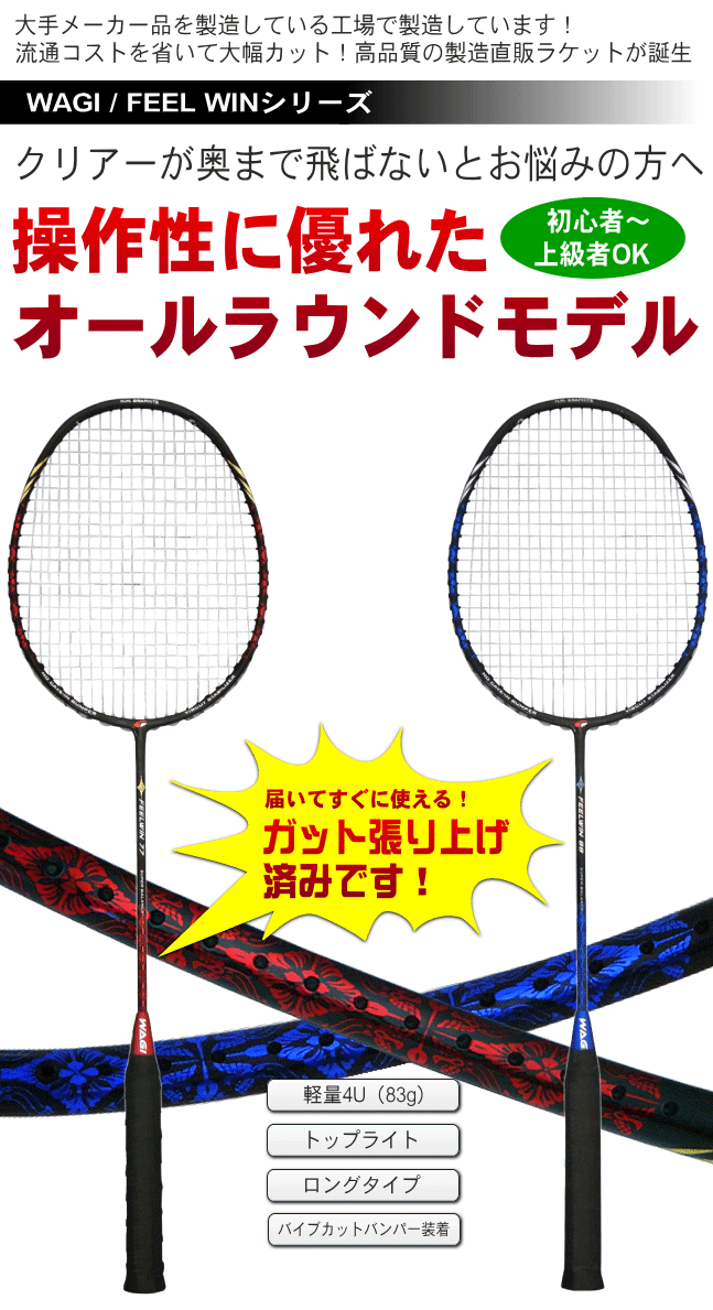 【全品ポイント5倍★12/5(金)23:59迄】オリジナルガット張り上げ済み!FEELWIN バドミントンラケット軽量4U/オールラウンドモデル:【製造直販ゴルフ屋】※