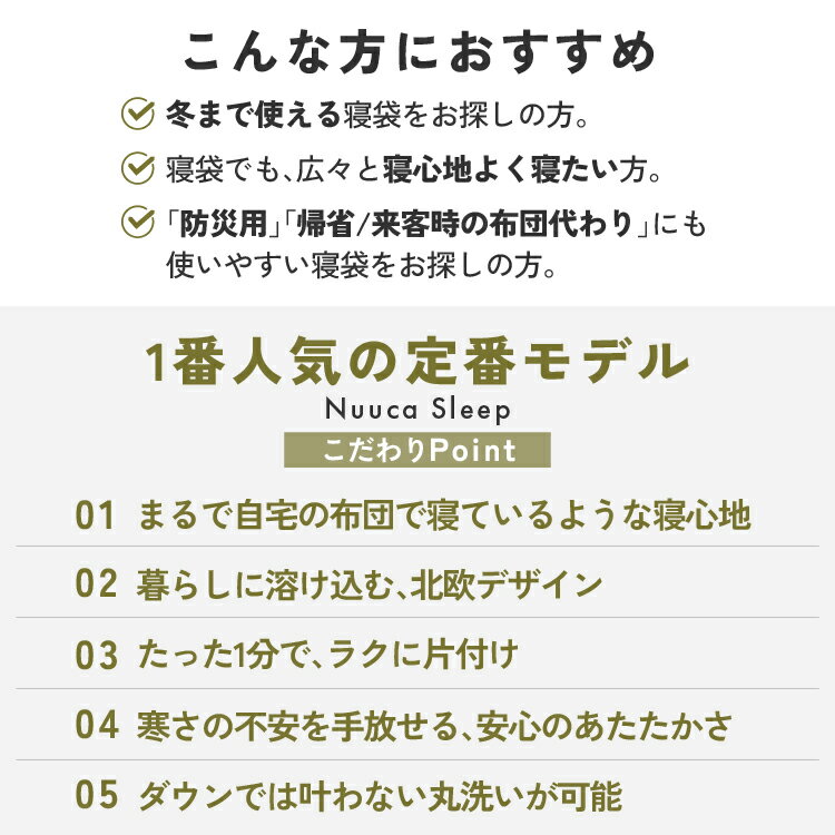 Nuuca 寝袋 防災 来客用 布団セット ヌーカスリープ【ISO国際基準 -10℃】 北欧デザイン シュラフ オールシーズン 秋用 冬用 来客布団 布団 ふとん 客用布団 人気 おすすめ コンパクト 羽毛 封筒型 丸洗い 3シーズン 車中泊 暖房費対策 仮眠 夜勤 自宅用 帰省