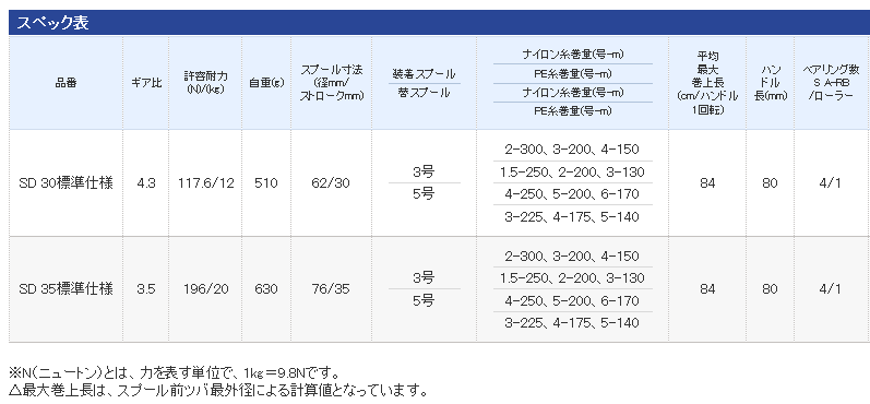 仕様/規格●ギア比:3.9●最大ドラグ力(Kg):15●自重(g):685●スプール 径(mm)/幅(mm):57/46●糸巻量フロロ(号-m):5-420、6-350、7-300、8-240●糸巻量PE(号-m):4-450、5-350、6-300、8-200●最大巻上長(cm/ハンドル1回転):70●ハンドル長さ(mm):75●ベアリング数BB/ローラ―:4/0●実用巻上持久力(Kg):6.5...