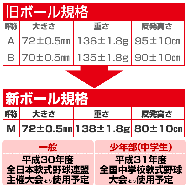 メーカー希望小売価格はメーカーカタログに基づいて掲載しています 仕様・規格 ●軟式用新公認球。M号ボール。 ●メーカー品番:M-NEW ●中学生の高校硬式野球へのスムーズな移行と、硬球がメインの海外への普及を目的とし新軟式ボールが発表されました。現在の軟式ボールよりわずかに大きく硬くなり、低く弾むため硬式に近い感覚でプレーができるようになります。 ※一般軟式は平成30年度全日本軟式野球連盟主催大会...